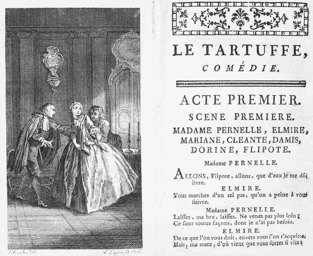 Dans le « Châtiment de Tartufe » sa critique est plus provocatrice. Il utilise le personnage de faux dévot de Molière, Tartuffe (orthographié par Rimbaud avec un seul « f ») pour dénoncer l’hypocrisie de l’Eglise. Si le personnage a tous les attributs et le vocabulaire d’un religieux « chaste robe, foi, chapelet, priait, confessait, … », ses agissements ne vont pas dans ce sens. Les 2 premiers vers « tisonnant, tisonnant son cœur amoureux sous/ Sa chaste robe noire.. » évoquent en effet une pratique qui s’apparente à la masturbation. « Le méchant » qui le punit le découvre d’ailleurs « nu du haut jusques en bas » sous son habit.